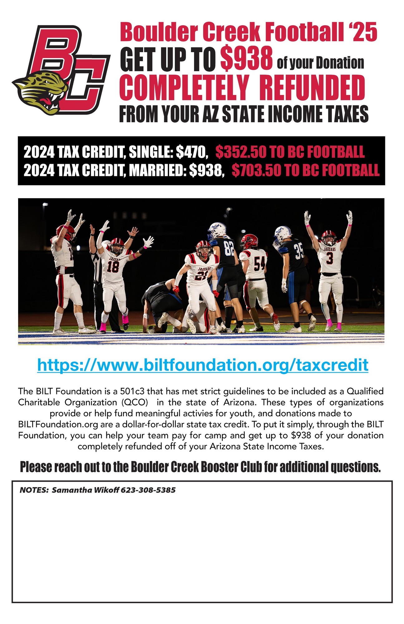 The BILT Foundation is a 501c3 that has met strict guidelines to be included as a Qualified Charitable Organization (QCO) in the state of Arizona. These types of organizations provide or help fund meaningful activities for youth, and donations made to BILTFoundation.org are a dollar-for-dollar state tax credit. To put it simply, through the BILT Foundation, you can help your team pay for camp and get up to $938 of your donation completely refunded off of your Arizona State Income Taxes.